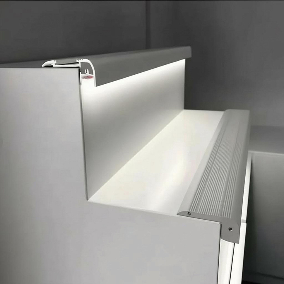 Это алюминиевый уголок (профиль), который монтируется на кромку ступени. Внутри него находится яркая светодиодная подсветка, а поверхность оснащена специальной резиновой или полимерной вставкой, которая не дает ноге соскользнуть.